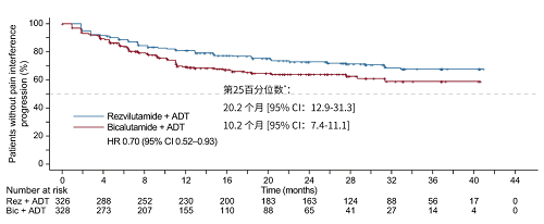 瑞维鲁胺+ADT组中位至疼痛干预时间更长(NR[95% CI:NR-NR]与NR[95% CI:NR-NR];第25百分位数:20.2个月[95% CI:12.9-31.3]与10.2个月[95% CI:7.4-11.1];HR=0.70[95% CI:0.52-0.93];p=0.015,图3)。